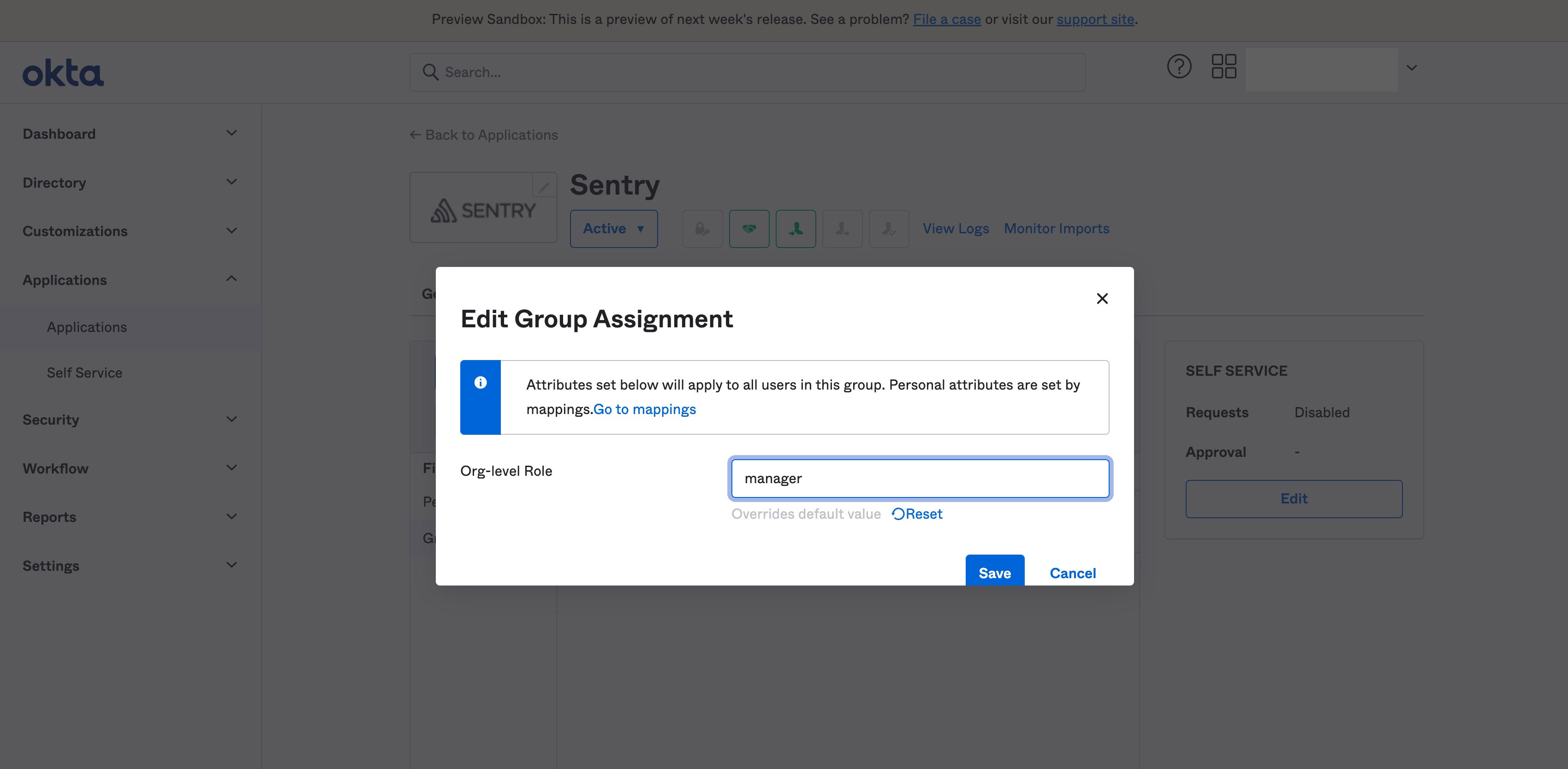 • Configuration of SAML SSO for Okta as documented here, or use the Okta sign-on tab in your Sentry Okta application to configure SAML.