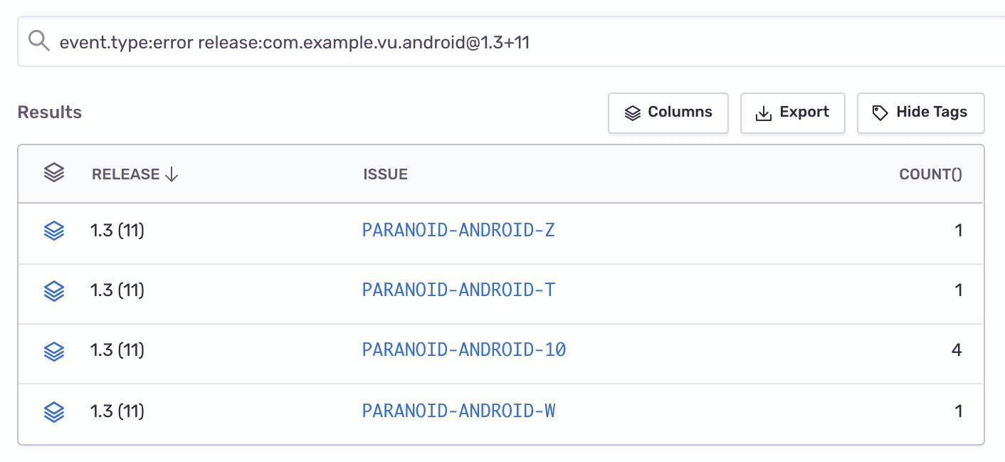 Each table cell has a dynamic context menu that allows you to continue exploring your data by automatically updating the search bar or the table columns, according to your selection. Actions like, adding or excluding values from the filter, opening a selected release, or viewing the underlying stack of issues: