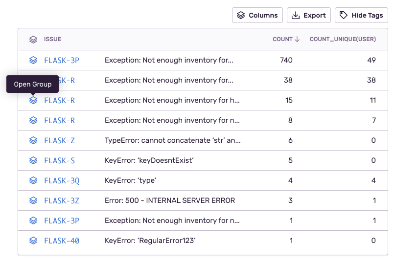 8. On each line item/issue, you can click on the issue name to open the Issue Details page and triage the issue. You can also click on the Open Group icon to continue querying through the events stack in the context of a specific issue.