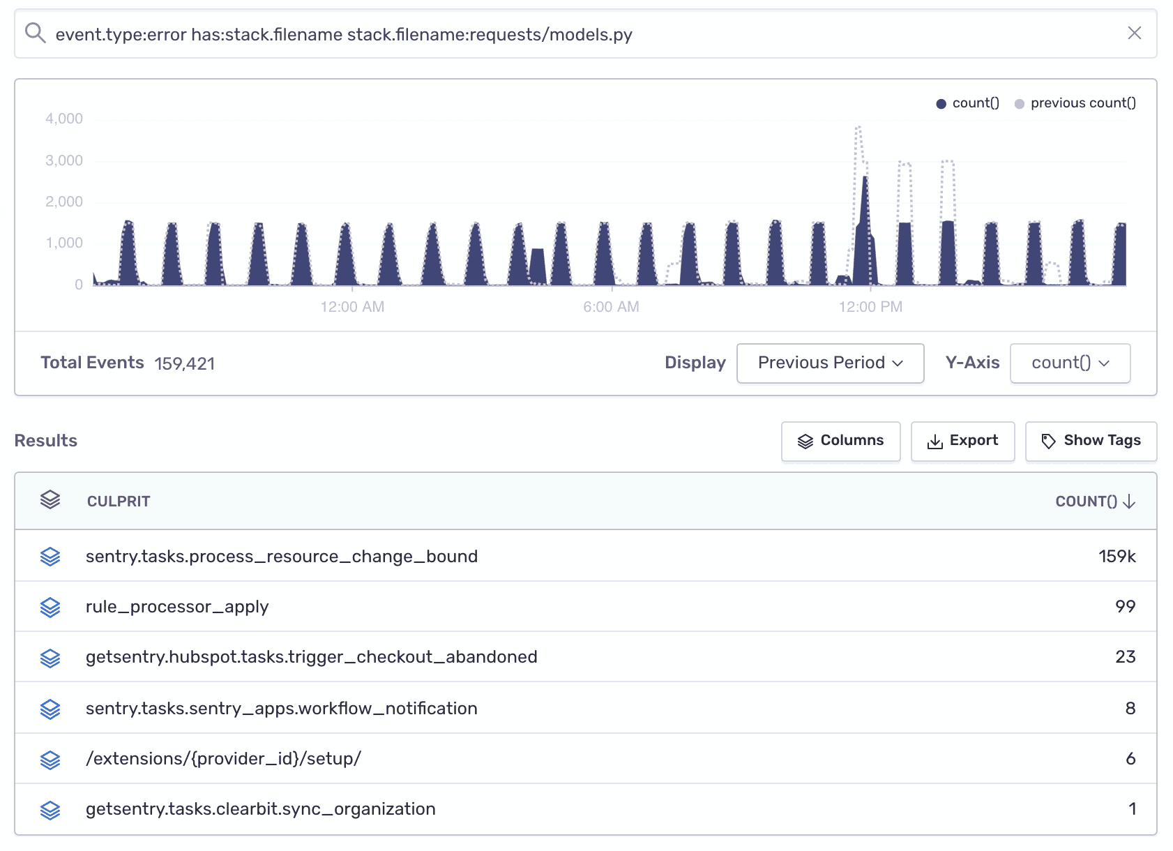 From here you can add a release as a filter and change the columns to count() and title to see similar errors. Then you can click the "Open Group" icon to drill down to individual events. You can also open the release in Releases from the "Results" table.