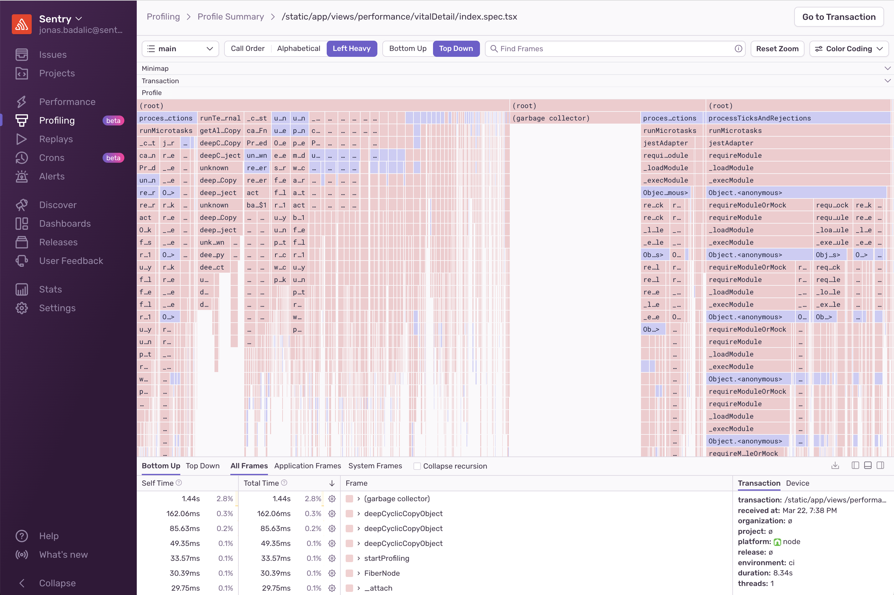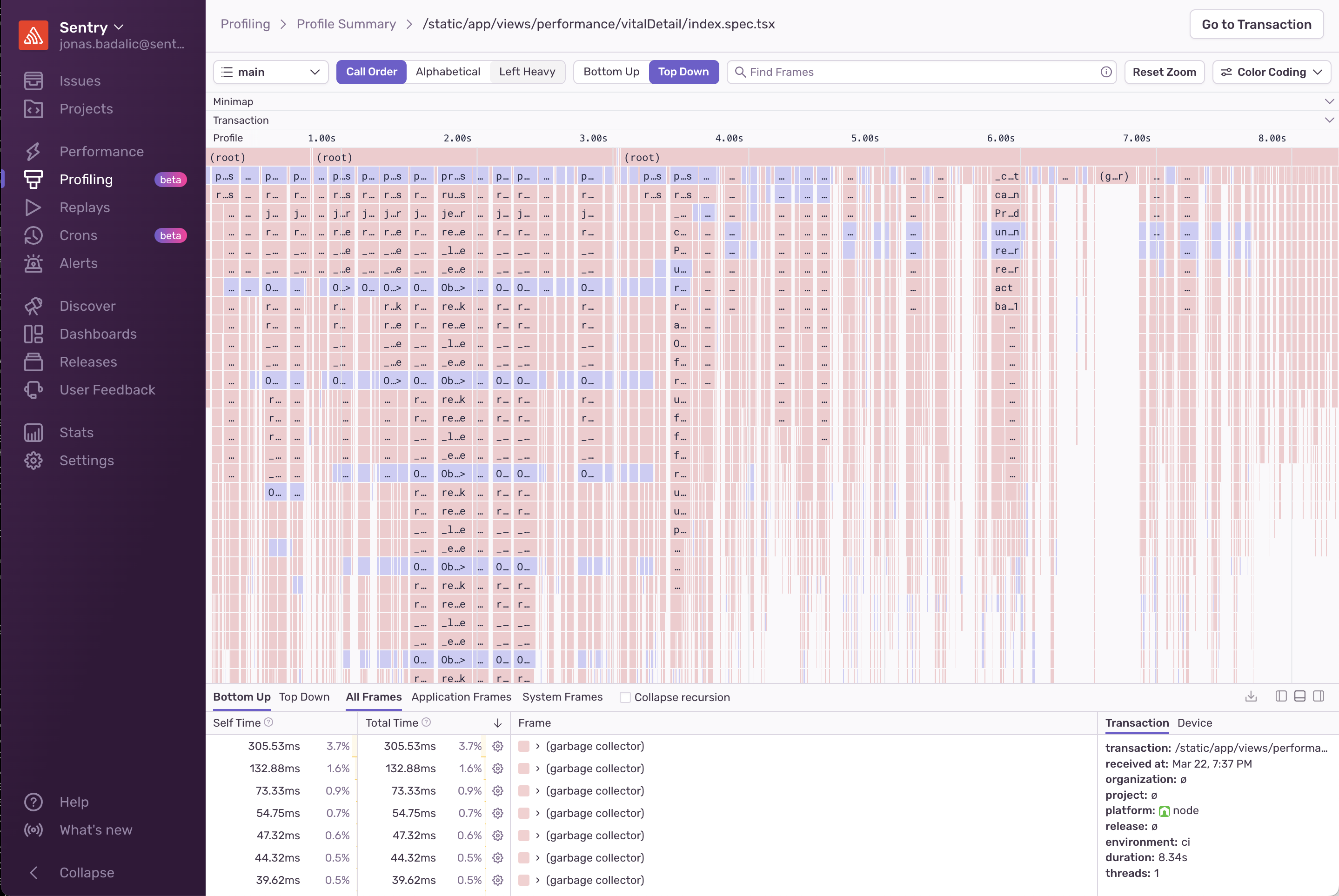 Profiling data can be used to gain insight into what methods and lines of your code are slow. Each profile has a detailed view that gives information about what happened in your code while the profile was collected and offers different ways to explore your profile data. This information can be found by going to the Profiling page in sentry.io, clicking on a “Transaction” and then selecting a “Profile ID.”
