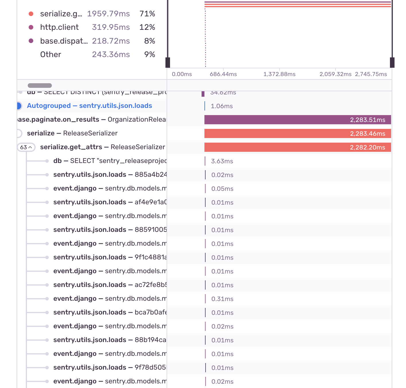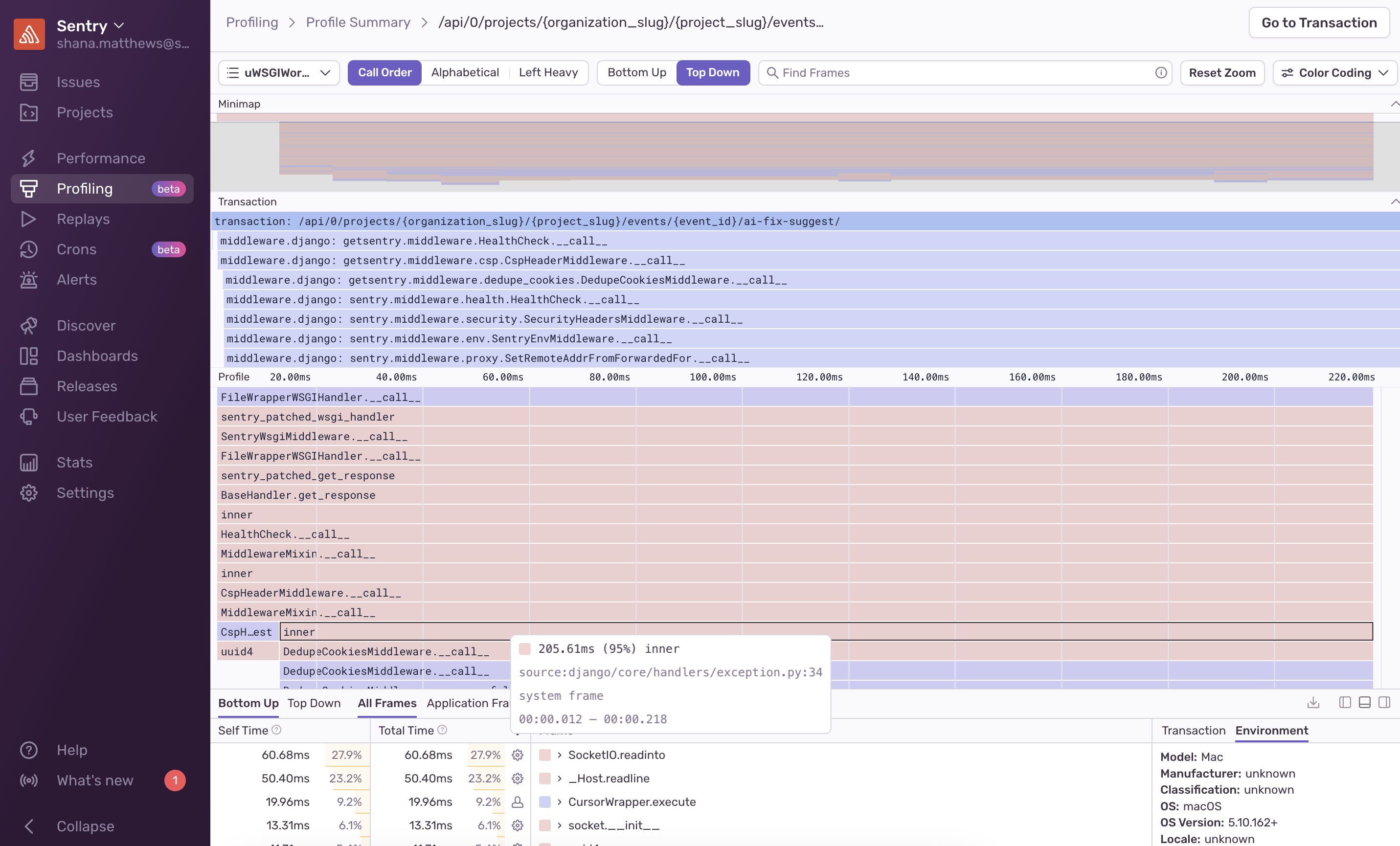 The “Transaction” section below the “Minimap” renders a tree of spans. It's the same view shown on the performance waterfall chart, but condensed to minimize white space. This view is helpful for cross-referencing profiler stack frames with span data.
