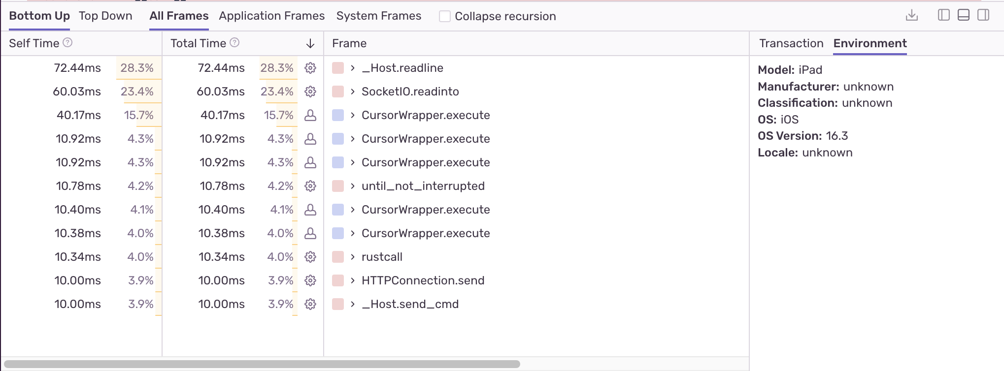 By default, the table displays “Bottom Up”, which shows the leafmost functions, or those with the most time at the top of a call stack. Long-running leaf functions are a good first indicator of performance bottlenecks.