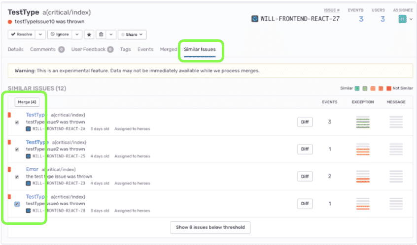 Warning: This will not affect the creation of future issues. In other words, any future event which would have created a new issue will still do so, regardless of similarity. Only events from the merged issues will be included in the new combined issue.