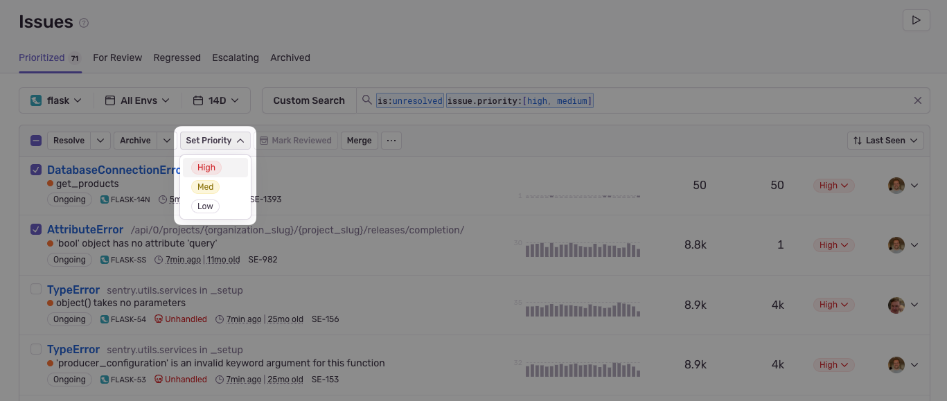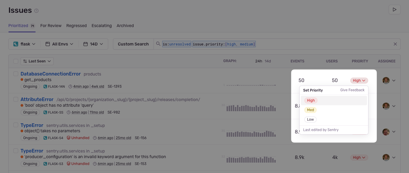 Issue priority sorts the issues Sentry receives into High, Medium and Low priority buckets. This helps you identify and address critical, high-priority errors that may be impacting your application's functionality and user experience first.