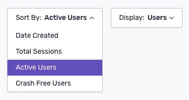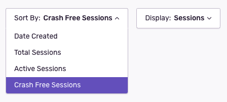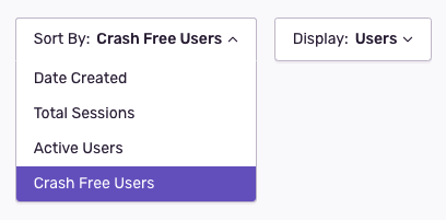 Depending on your "Display" selection, the sort options for the Releases page change. To sort releases by crash free sessions, select "Sessions" in the "Display" dropdown, and to sort by crash free users, select "Users".