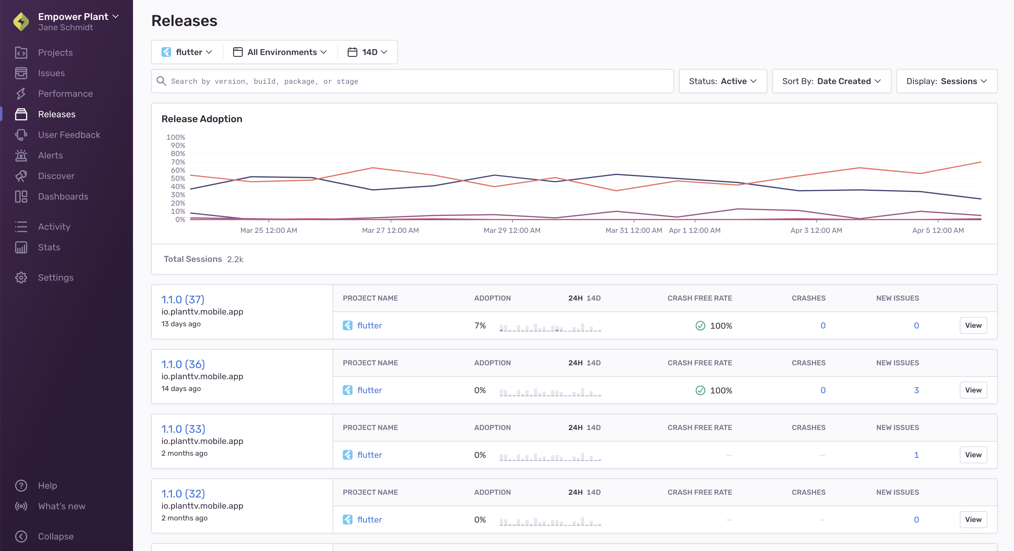 • Session adoption - The number of sessions of a specific release in the last 24 hours.