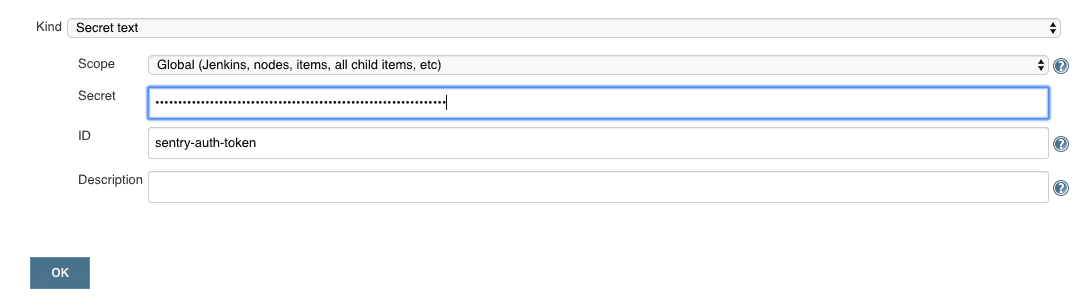 • credentials('sentry-auth-token') refers to the ID of the credentials just added to Jenkins.
